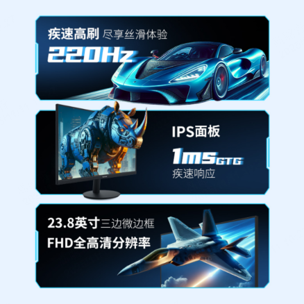 三邊微邊框設計進一步增強了沉浸感,玩家在多屏拼接或專注游戲時,幾乎感受不到邊框的存在,視野更開闊,戰斗更專注。配合220Hz高刷新率和1ms GTG響應時間,小屏高刷低延遲的組合不僅提升了視覺沖擊力,也讓玩家在激烈對戰中保持專注與冷靜,精準掌控每一次操作節奏。