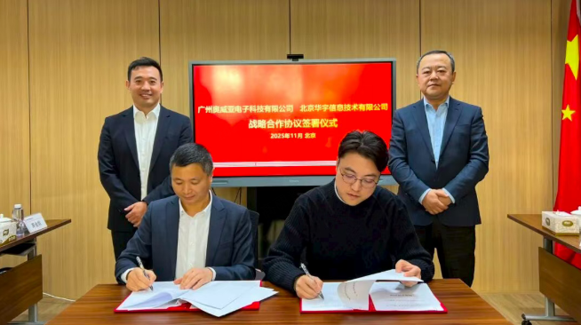 【數(shù)字視聽網(wǎng)訊】11月14日,廣州市奧威亞電子科技有限公司與北京華宇信息技術(shù)有限公司正式簽署戰(zhàn)略合作協(xié)議。奧威亞總經(jīng)理王勇與華宇信息總經(jīng)理馮顯揚(yáng)共同見證了此次簽約。奧威亞副總經(jīng)理?xiàng)铊搓膳c華宇信息移動(dòng)生態(tài)部總經(jīng)理王博分別代表雙方簽約。