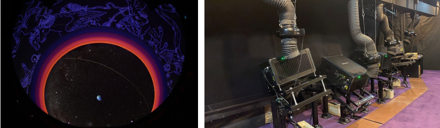 極具沉浸感的畫面(左)由科視 Christie Griffyn 4K35-RGB 投影機(右)以環形分布于穹幕周圍共同呈現